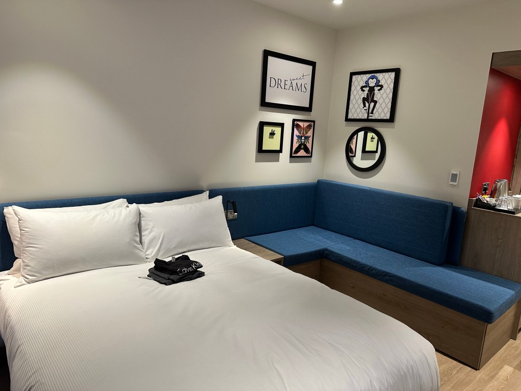 The first thing I noticed were how quirky the pictures were. They’re not something you see everyday. I like how the sofa is integrated with the bed but on the other hand it really does give me that caravan vibe. But I thought “oh this is the cheapest room so that makes sense!” Also, that think in the right is the air con. The week I stayed in this room was the hottest week of the entire year. It was much appreciated and made me feel like I was back in the land down under. 12/10.