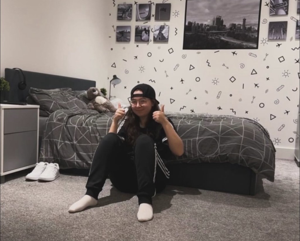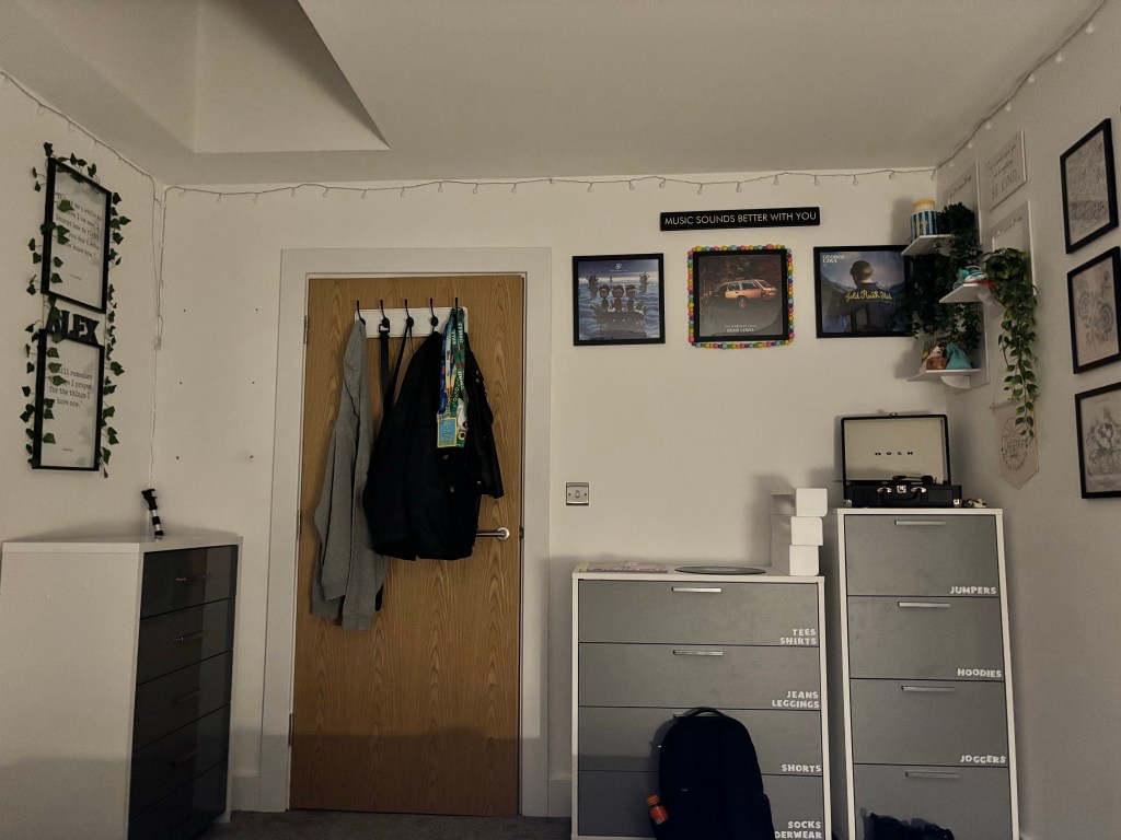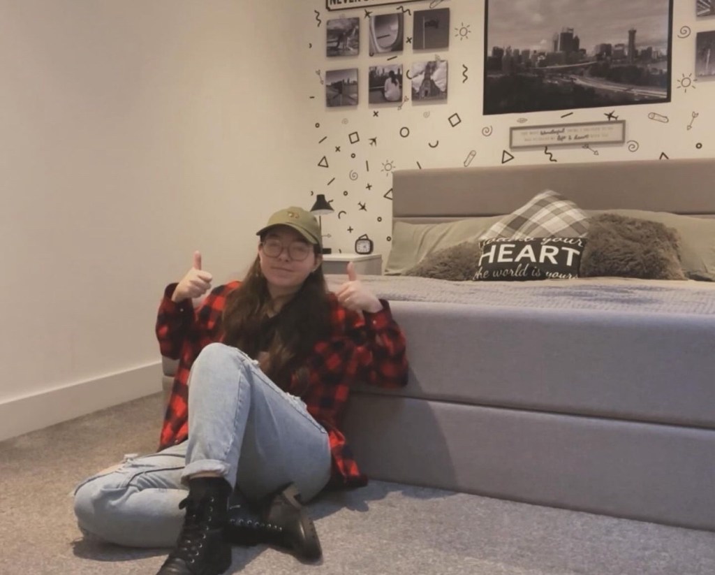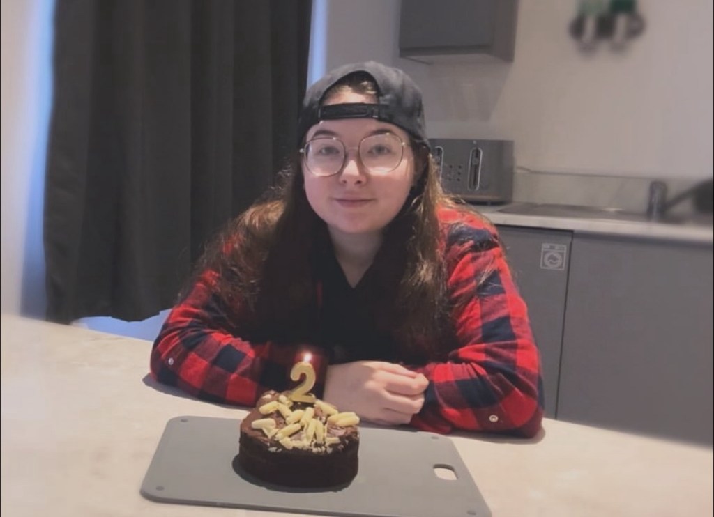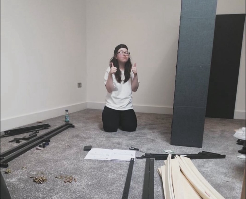 I moved out in the middle of 2022. As I’m writing these words, I have been here for just over two years… I celebrated it with a cake and everything. Simply because I never thought I could do it, but I did, and I’m still doing it. When I first got my keys and ordered a new bed, my mum was sat in my hallway, my dad asked how we were doing with moving in all my stuff so my mum took a picture of me in that moment. I was in the middle of building my bed, and I simply put my thumbs up. For the next two years I have recreated that picture the best I can with my tripod and camera, I will add the pictures here.