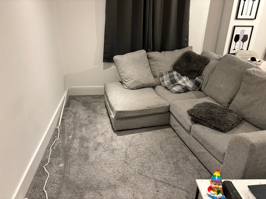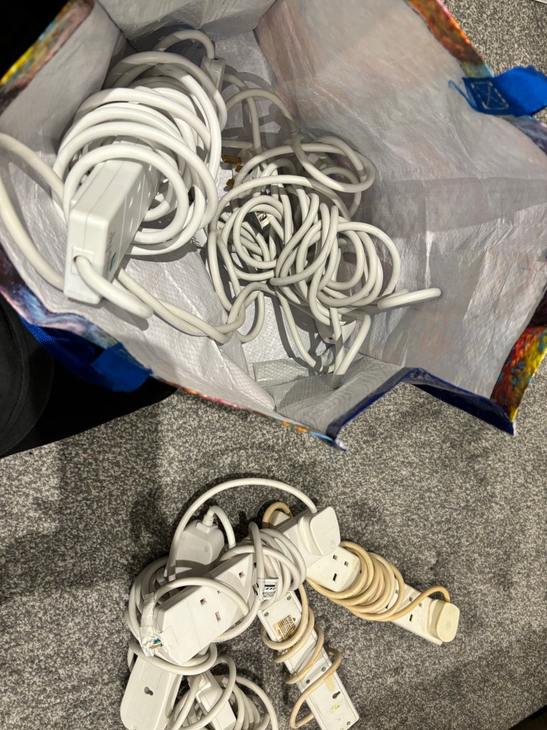 Realising the first picture doesn’t make much sense. But this was my living room just after my parents picked up my… their tv unit. And a small cameo of BabyGay the garden gnome in the bottom right corner. Hey dude, lovely to see you. And the second picture was the amount of extension cords that were now rendered useless due to the amount of technology I had… detoxed. Maybe I should have took an after picture, eh, the sofa is against the wall now, that’s about it.