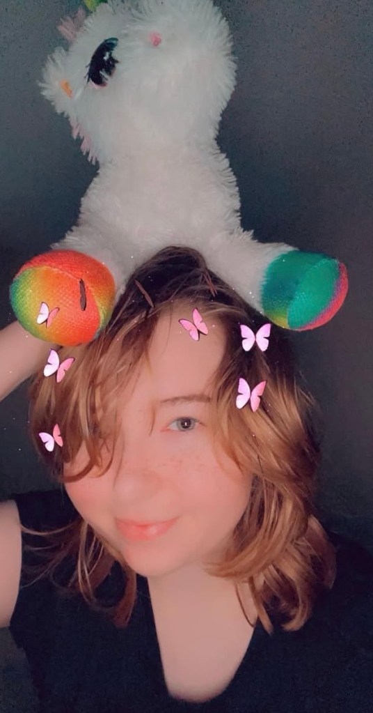 I probably didn’t have to save every selfie but… hey ho. Photos one and two are from August 2021, and photos three and four are from September. The fifth photo is from October, when my hair was finally long enough to slick back into a bun!! The unicorn is called Pixel, by the way.