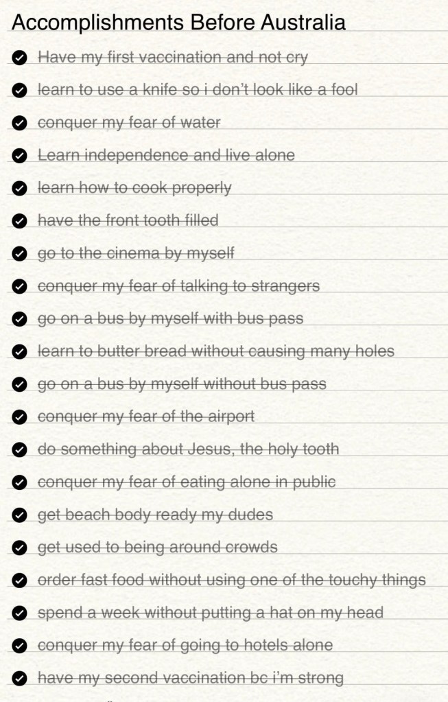 This was the list, everything I had to accomplish before I could sit my butt on that plane. And I did them all. All the fears I overcame… only for them to come back in full swing a few years later, but, I will get better.