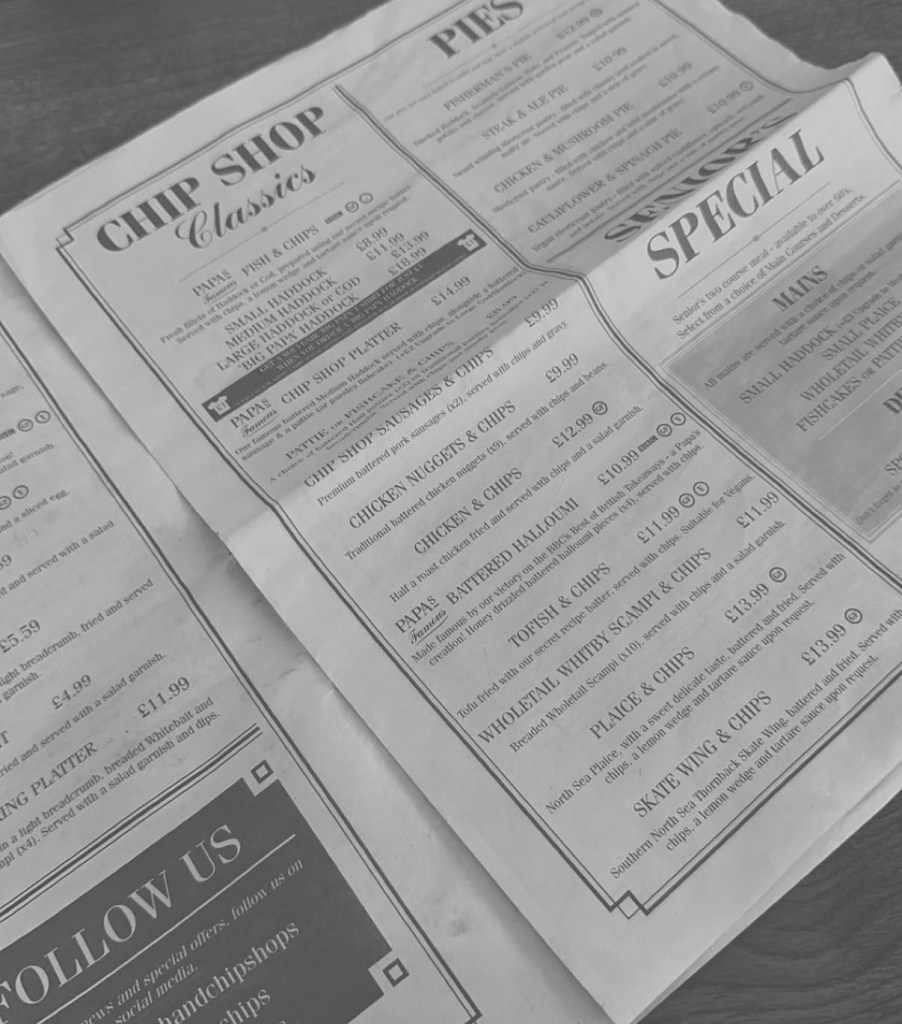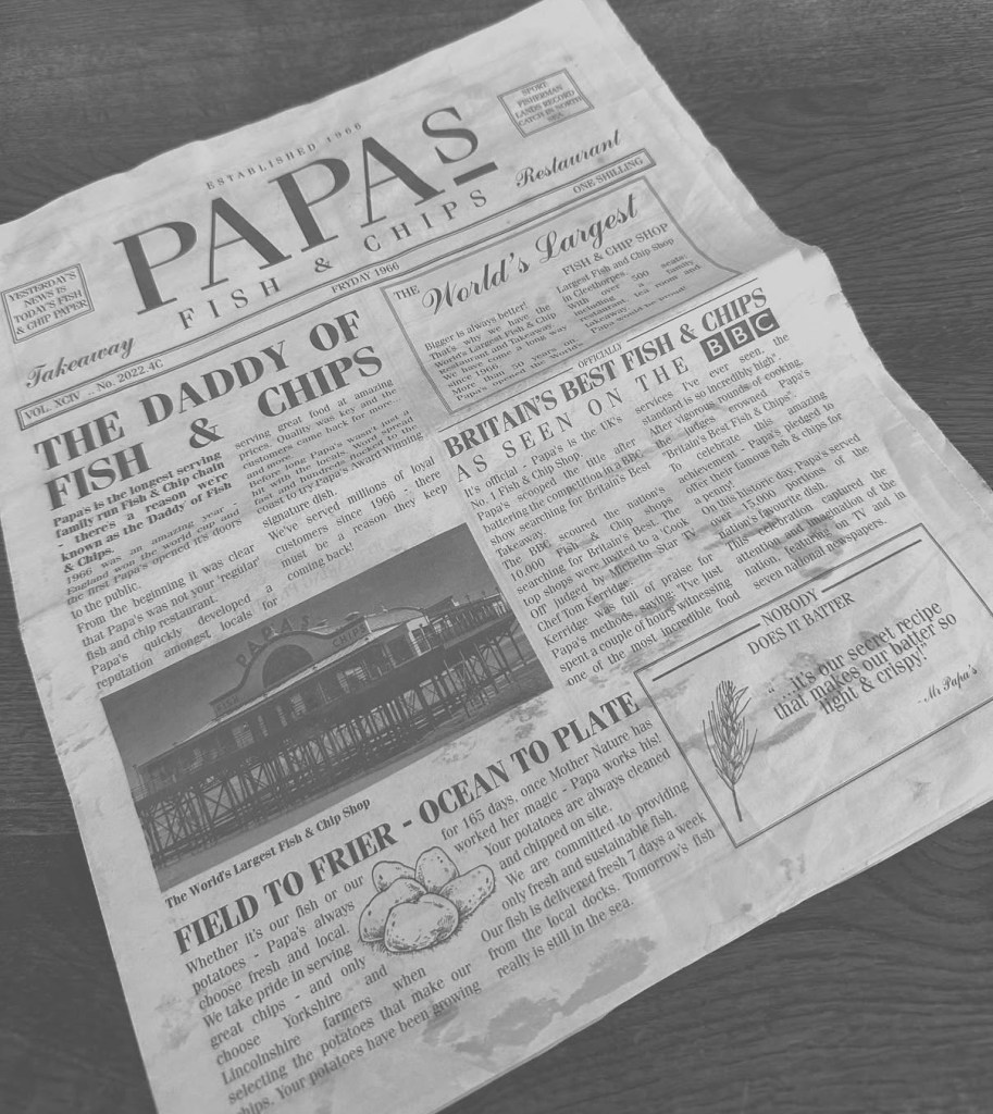 All this food is making me hungry haha! The first picture was my J2O at Coral Island Buccaneers Bar & Grill, the second photo was my favourite ice cream at my favourite bingo hall, Bingo3000! They have a whole ice cream bar there when you can choose anything you want! The third photo is my meal at that same bingo, and the fourth picture is the meal I had at Coral Island Buccaneers Bar & Grill, which I think was on the last night of my trip. The fifth photo was another random ice cream, obviously. The sixth picture was fish and chips at a cool place, I think it was called Papas Fish & Chips, their menu was an actual newspaper! I can post the pictures of that below.