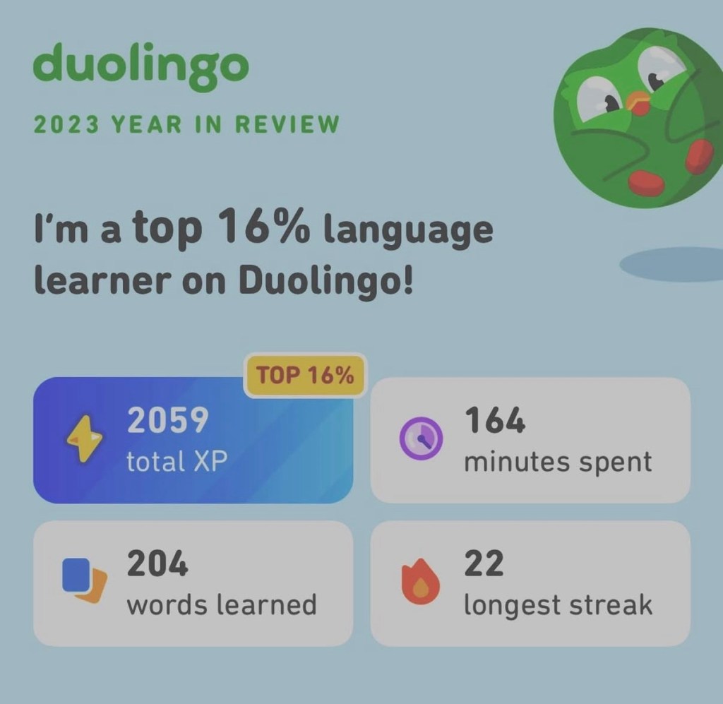The end of the year now! There’s something about seeing all my photos later out like this which is so satisfying to me. This was the thing I got from Duolingo at the end of the year that says I was in the top 16% of language learners, as well as my Christmas gifts from my parents!