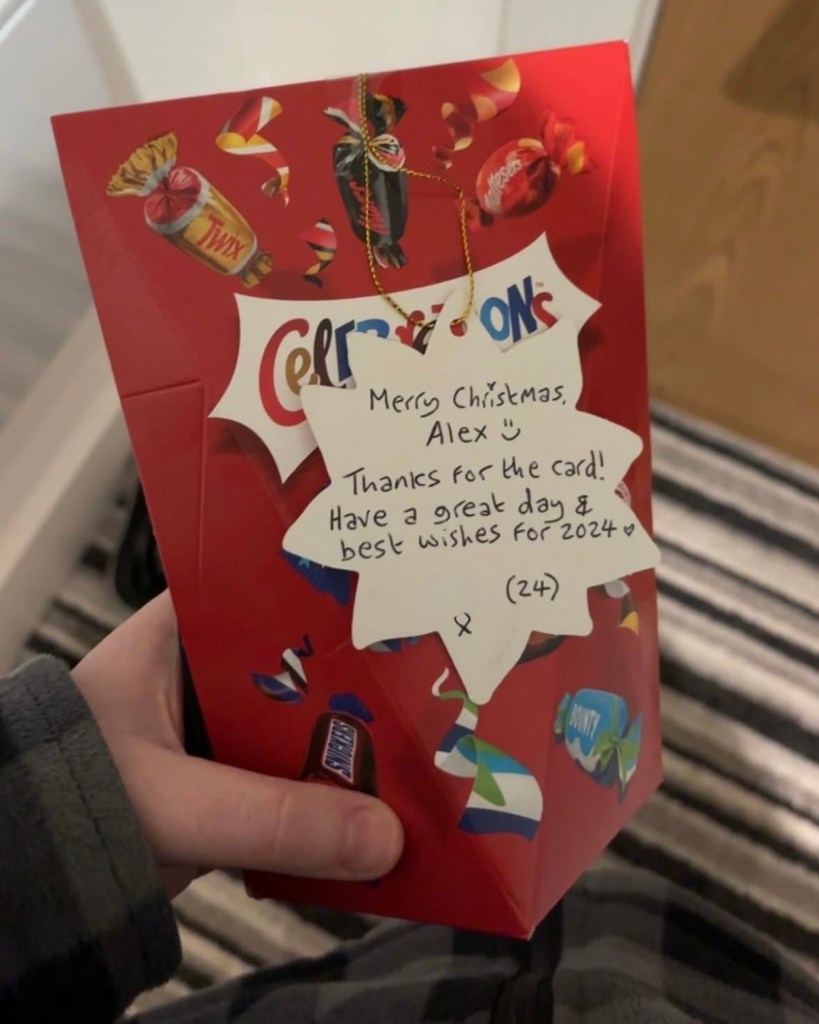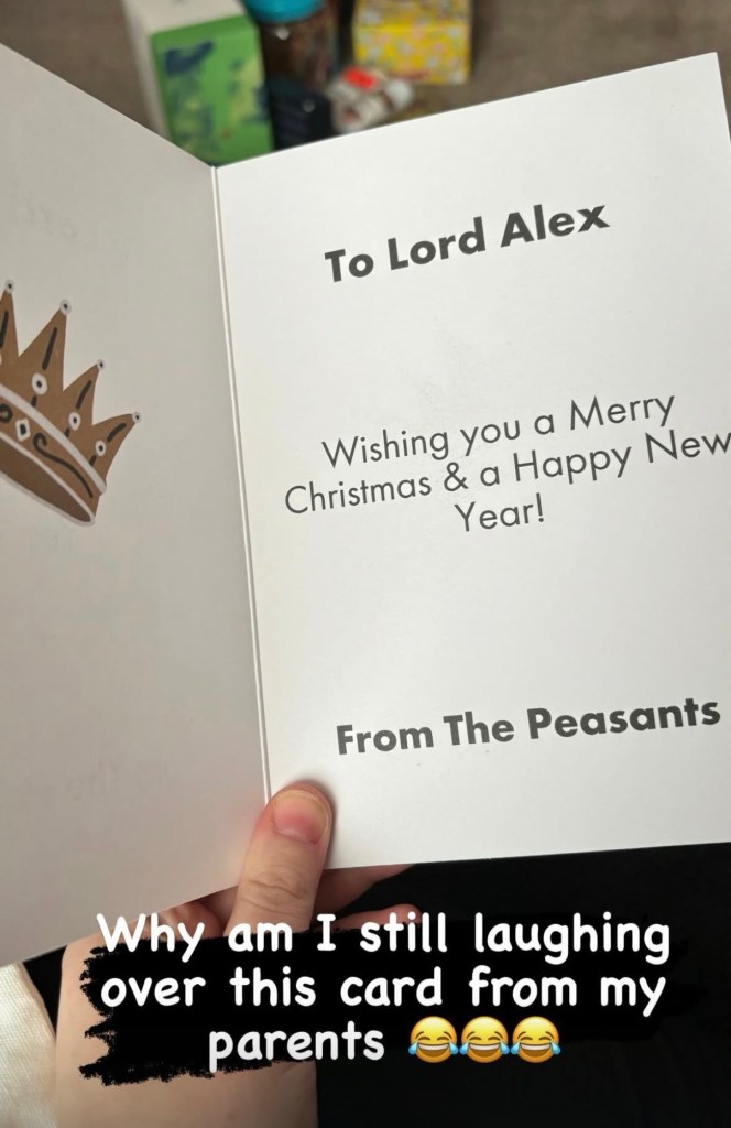 I have, with the power of iPhone editing, removed all names but these were the Christmas cards I got back after sending mine earlier on in the month. The last one is from my parents, I don’t know why or how the whole ‘lord Alex’ and ‘peasant’ thing started, it was an inside joke from when I was a lot younger haha.