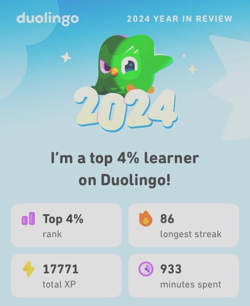 I got my yearly review on Duolingo, making it into the top 4% of language learners. I bet that was the thousands of attempts to perfect those songs on the piano part of the app haha. The second photo is a koala I learnt to draw using a new drawing app.