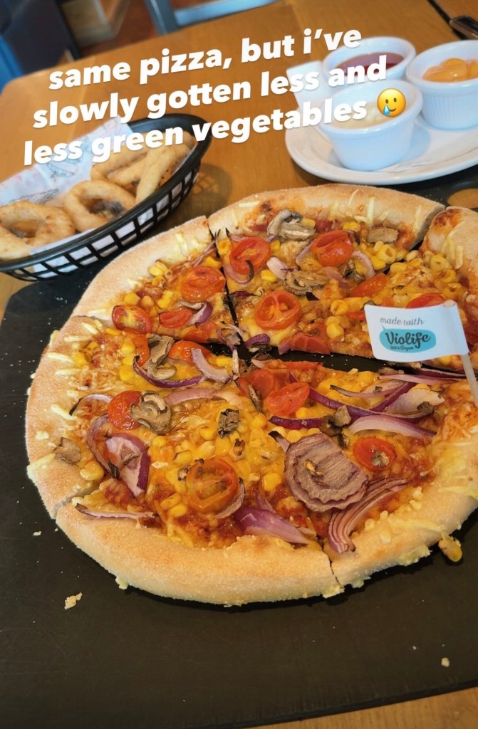 This was the year Pizza Hut closed down, so sad. But this was my last pizza I got from there. Really, the amount of green vegetables on these pizzas was dwindling down year by year, but I’ll always be loyal to my vegan cheese!