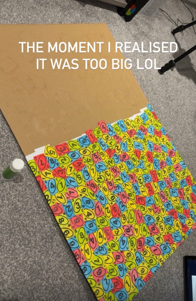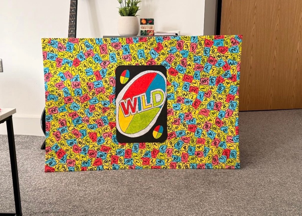 By November, I had finally finished my Uno painting. The second I had completed this I hated it. I did make a much smaller one which I spoke about in the post I made about my paintings, but as far as this big one is concerned, I hate it so much. I don’t know if it’s the size or the orientation or whether the wild in the middle needs to be bigger… I don’t know.