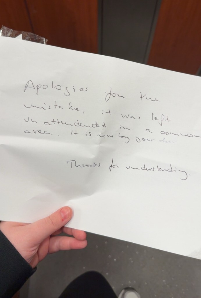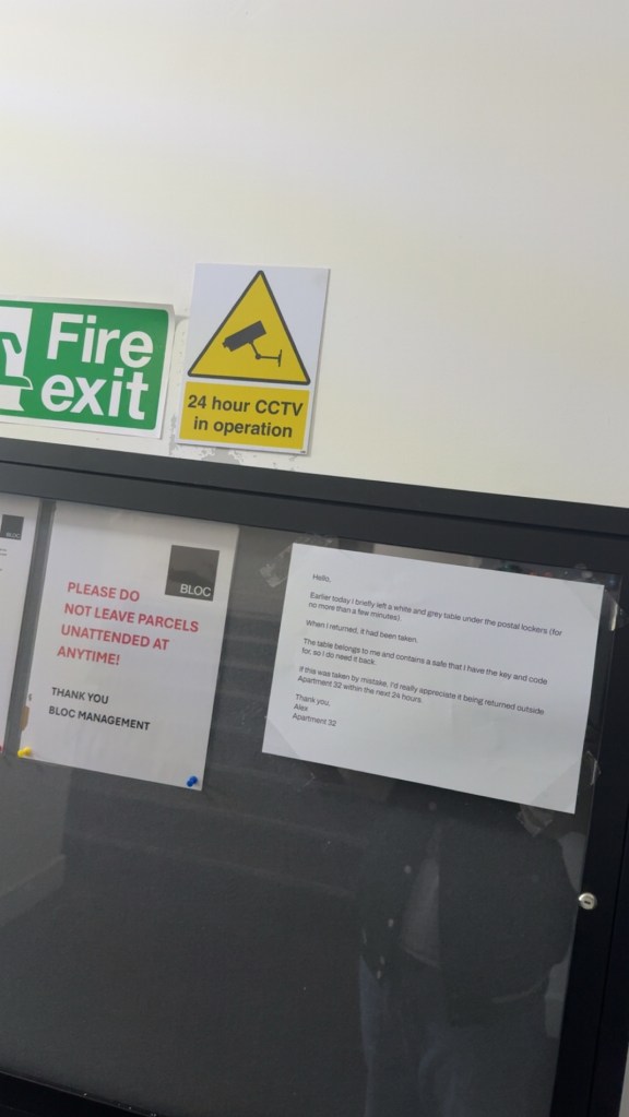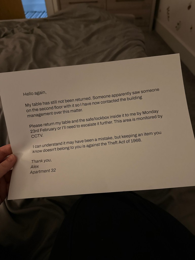 My neighbour’s friend didn’t know at the time of seeing them, that it wasn’t their table, if they’d have known, they would have said something. So me and my neighbour wrote a slightly firmer note, letting the thief know that someone did see them. We then put the second note, pictured on the right, up the following night when we went down for a smoke haha.
