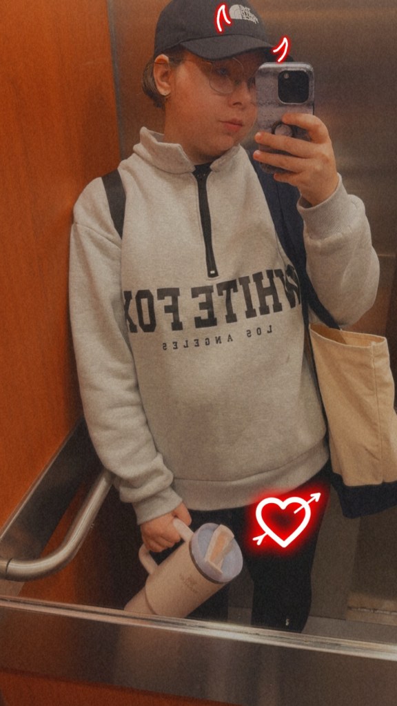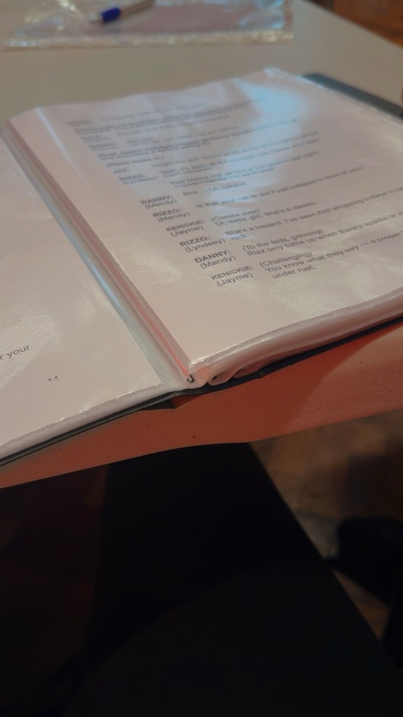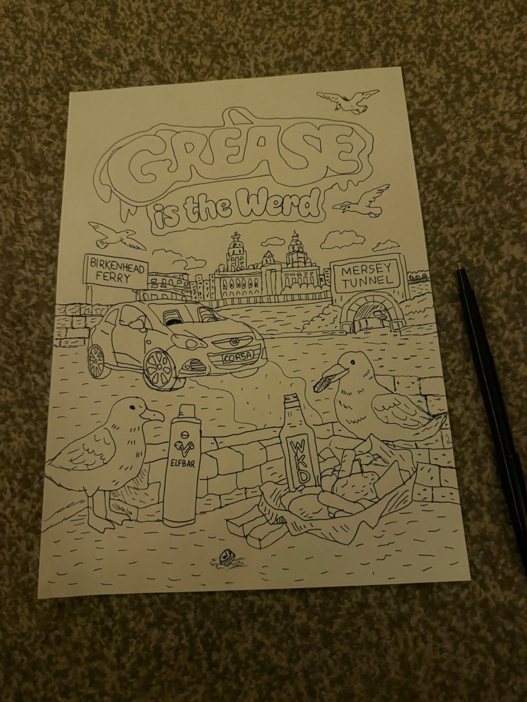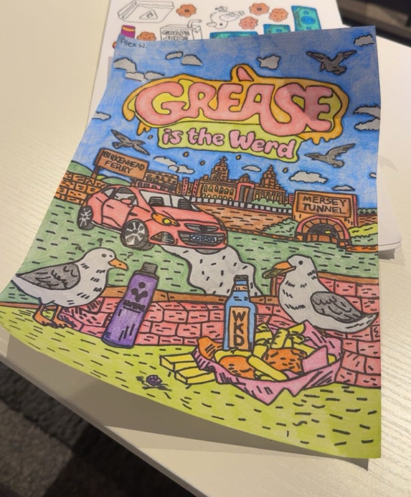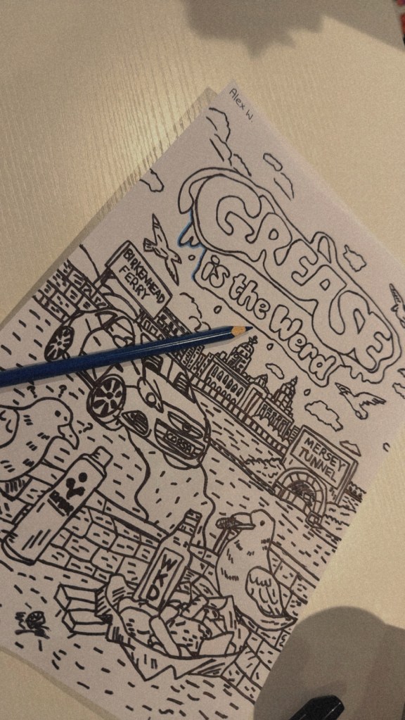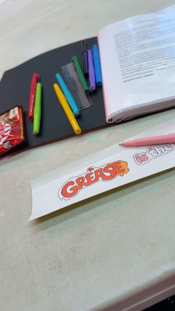 I stopped going to my theatre thing and my choir for a while. I was kind of just… waiting… to be better. But towards the end of the month, I realised I might not get ‘better’ in the way I was hoping for many years, but it’s about learning to adjust to a new normal. So I started going back to my extracurricular groups. My choir especially is for people who struggle mentally, but this is the front cover I drew for my theatre script. We’re doing a… scouse version of Grease lmao. I didn’t get the spine done so I took it to class and finished it there while I ate a KitKat.
