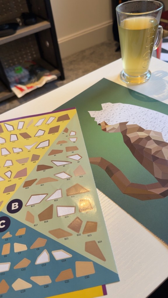 I got this sticker book around Christmas time, it’s the same kind of book I’ve completed on my YouTube channel a year or two ago, but I find them really fun and therapeutic. This one is all full of kitties! I spend a lot of my mornings doing one of these until the sleepy effects of my meds wears off.