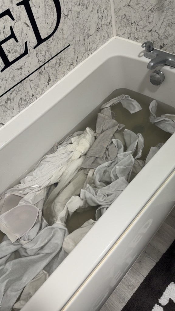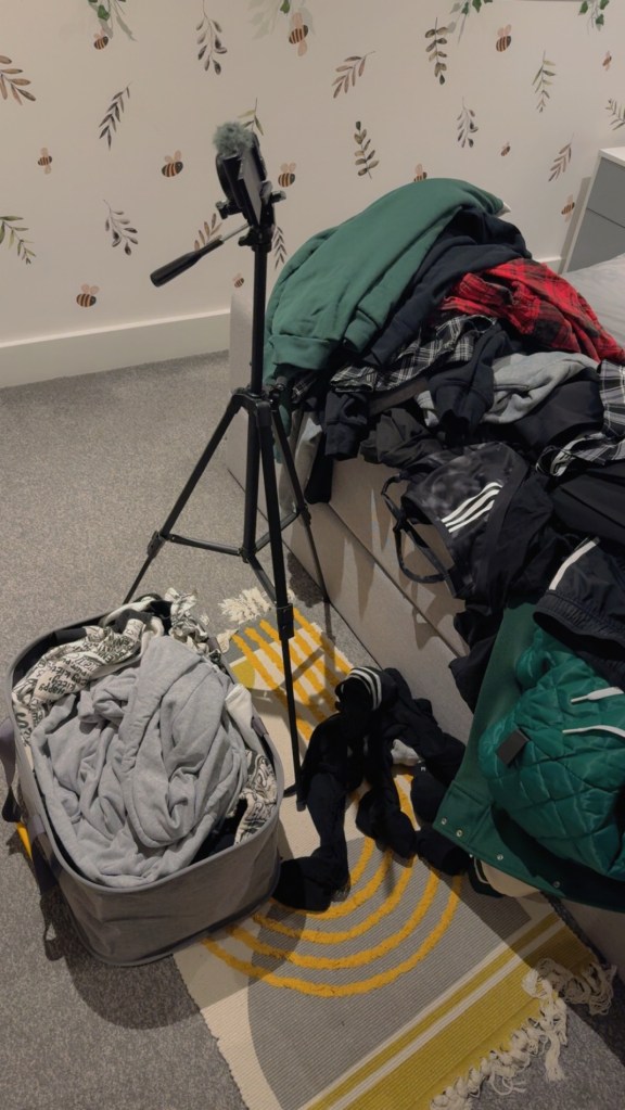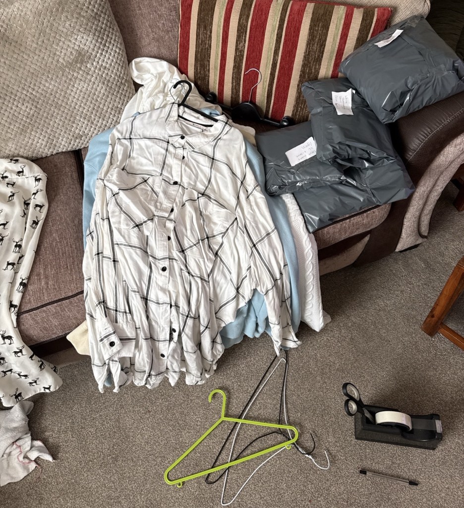 I went to my parents house one afternoon to help my mum list her clothes she doesn’t wear anymore on Vinted. I put them all in a pile, then went one by one hanging them on the back of the living room door, taking many pictures and them putting them in a mailing bag- and so my mum knows what item is which, I added little post-it notes onto each item so all she has to do is take the package and post it.