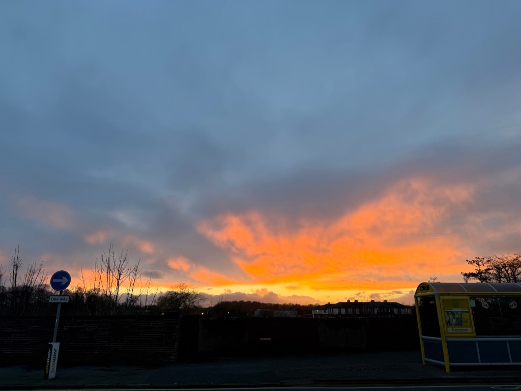 This photo was a sunset that I took next to the place where I post my things I sell on Vinted. See that buss stop in the bottom right? I sit there a lot. Watching everyone go about their life in their cars. Waiting. For busses.