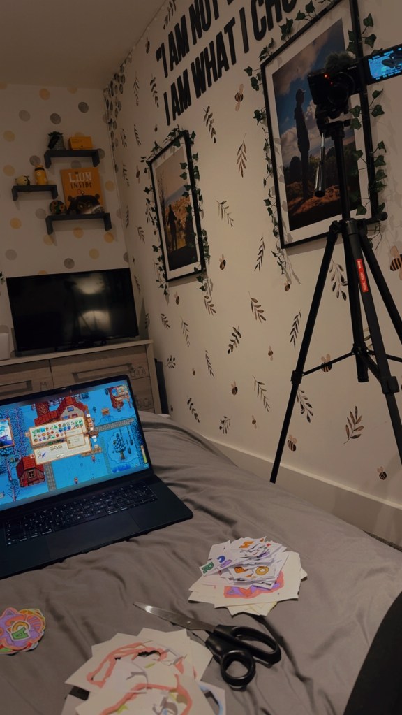 As my meds started to increase more and more, I started to feel a lot more… lousy. But that wasn’t going to stop me from filming my project that I’m correctly working on. I stayed on my bed (the meds make me very dizzy and nauseous) and filmed from there while watching a 5 hour long stream of Stardew Valley from my comfort YouTube channel, James Turner!