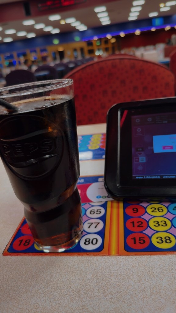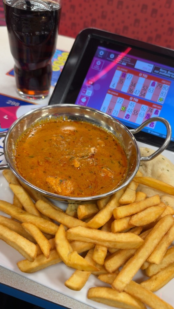 Photos from when I went to play bingo (yes I am 94 okay) at my local bingo. When you stand in the smoking terrace you can literally see my front door to my apartment building! The photo on the right is my favourite meal to get from there… well, it was… until they swapped the popadoms for stale naan bread. Not a fan.