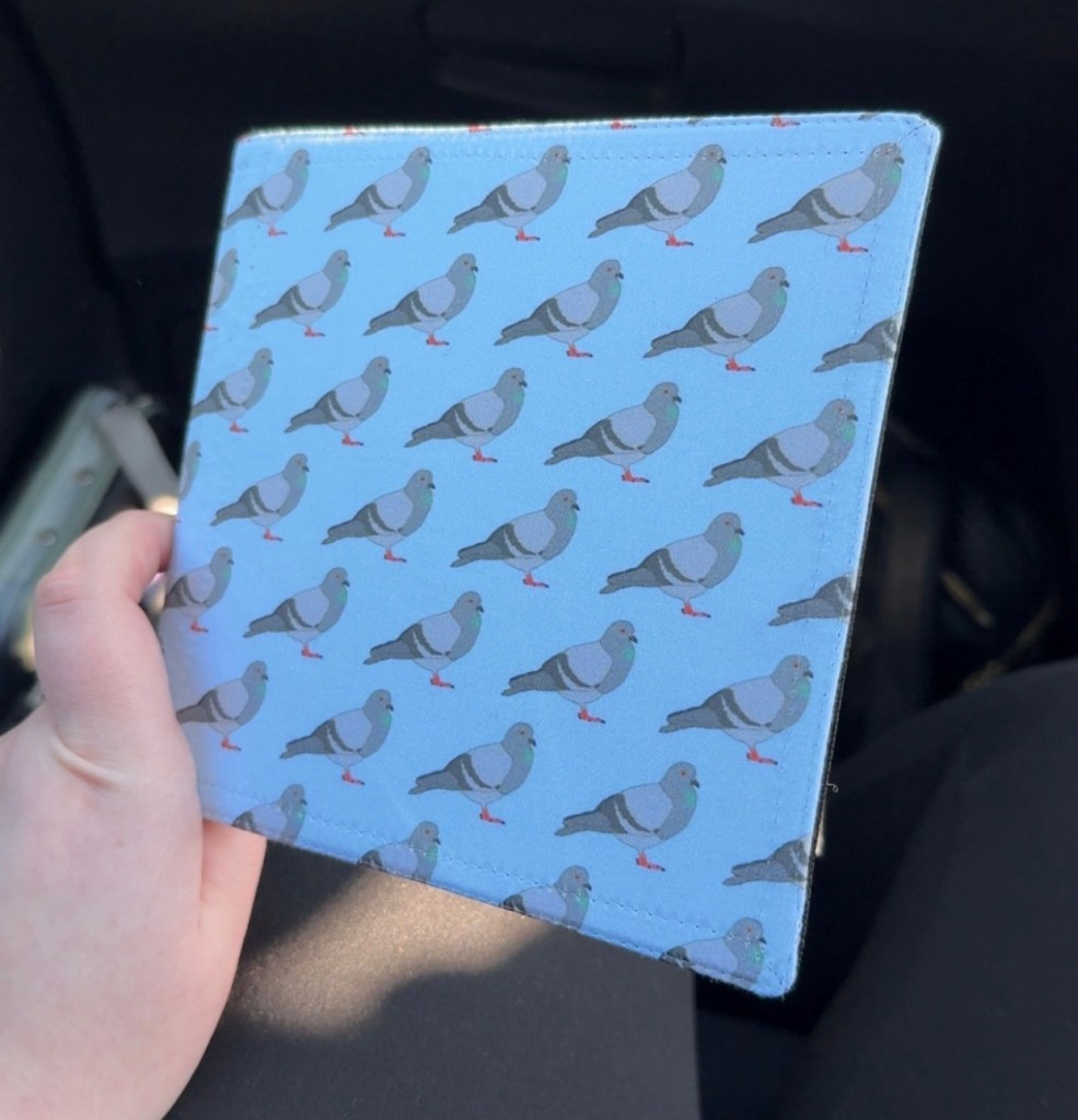 Look at this badge holder I got for my new badge! Yes, I much would have rather it been seagulls, but we can’t have everything… I love pigeons though. Lots of people call them flying rats… but they are creatures on this earth just like you and I… just trying to eat and exist alongside us. They never hurt us or cause violence, bless.