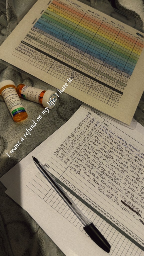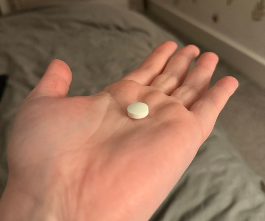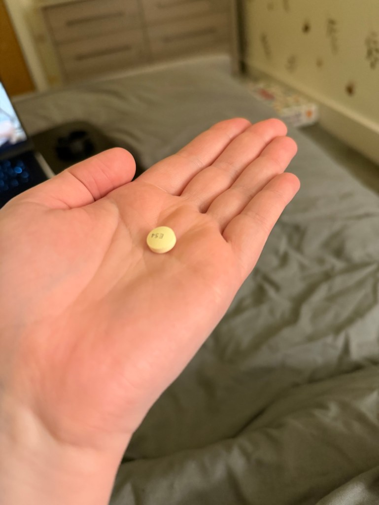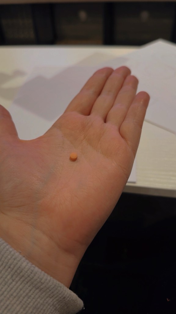 This was when I started taking 350 in the morning and 350 at night I think this pill was the bigger one… so the one earlier under the post would’ve been the 150mg and this one would’ve been the 200mg. Also, the first picture was taken when I started crying over how confusing my charts were getting, the ones I have to fill in for my psychiatrist. I sat back and started getting upset thinking “is this my life now?” and it was a bit like an existential crisis.