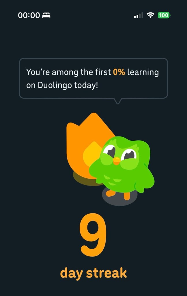 This was when my Duolingo was super proud of me for being among the first 0% learning on Duolingo that day, or because I somehow stayed up until midnight and did my Duolingo then. Duolingo is one of those things that I forget about for three months and then get a three month streak and the cycle continues around and around.