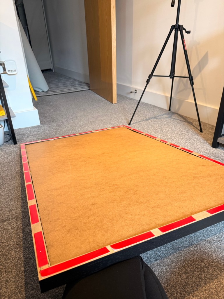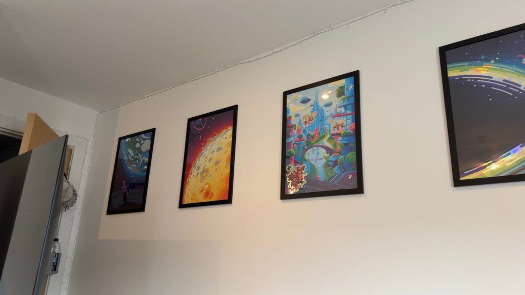 The frame really didn’t take too long to arrive, and I had to cut down my painting ever so slightly and I have to do a few repairs on the bottom right corner, but for the most parts it fitted like a glove. I stuck it up with no more nails tape and it stayed up perfectly.