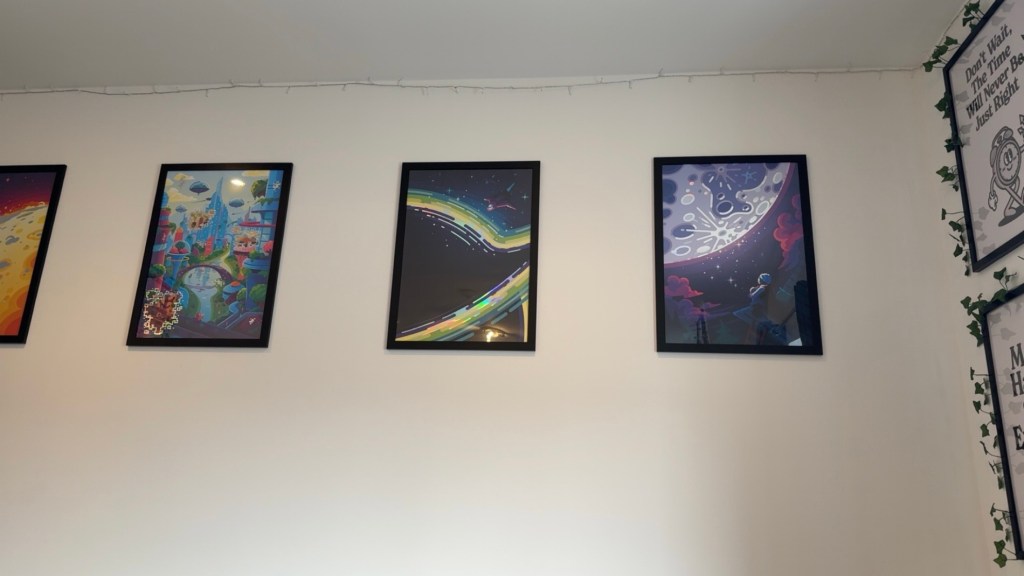 On the same day, I put up my other posters, they are the frames that my dad got in from the Amazon man that day. They’re pretty big frames and they do want to wallpaper the wall that they’re on at some point. I want like a white wallpaper with black doodles of houses and towns or something like that. I did a lot of measurements to make sure that there was equal spaces between the wall and the pictures and also between the pictures themselves. It was rather stressful indeed!